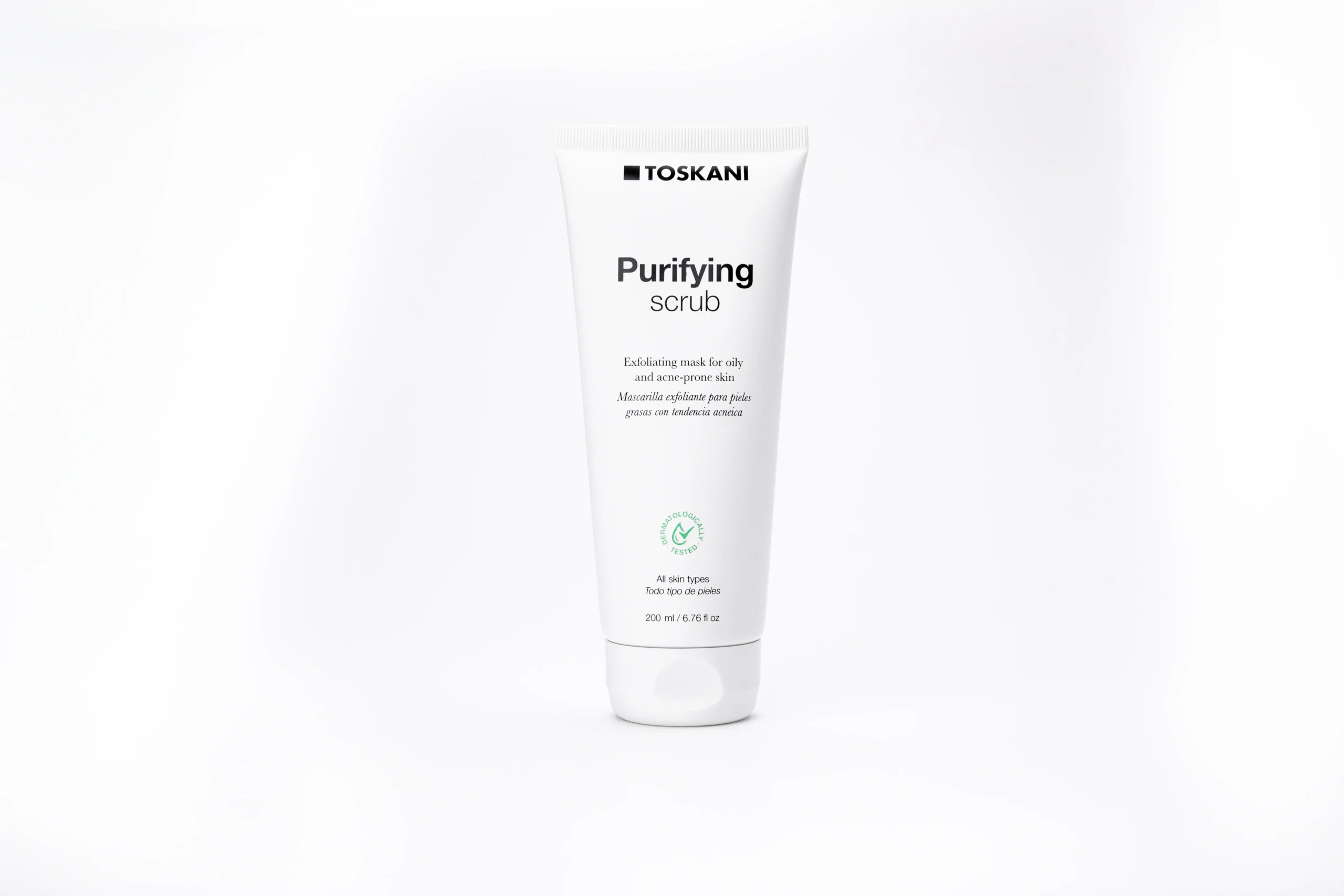 TOSKANI Purifying Scrub is a skin-clearing, water-based scrub recommended for combination and oily skins. Formulated with Moroccan Clay, this purifying scrub removes excess oils and exfoliates the superficial layers of the skin, eliminating dead cells and purifying pores. Skin looks more luminous while shine and dryness are minimised. It is formulated with Hammamelis extract with astringent properties, which leaves a refreshed and even-toned skin.