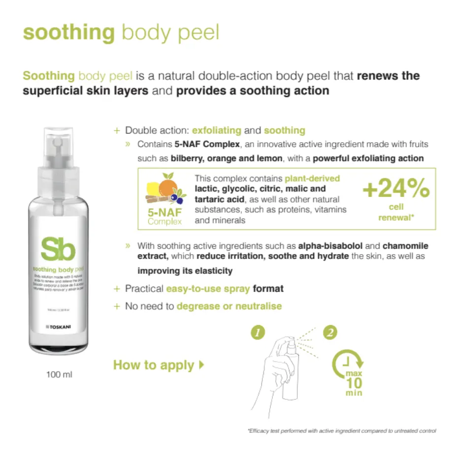 Soothing body peel is a natural double-action body peel that renews the superficial skin layers and provides a soothing action