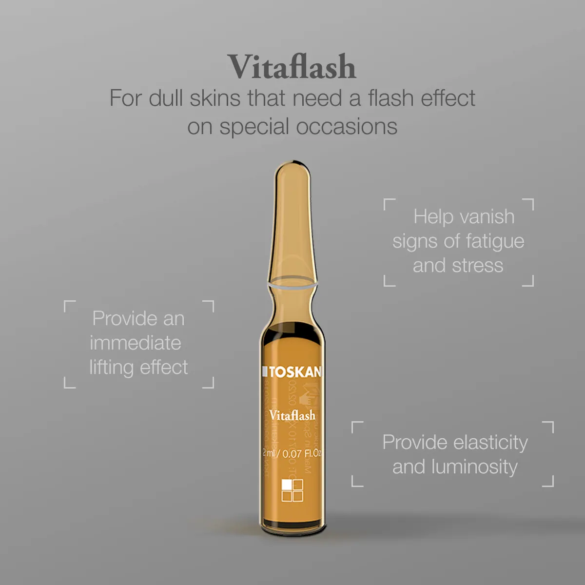 The Vitaflash ampoule is designed for occasional use to provide an instant lifting effect and even skin texture and radiance.